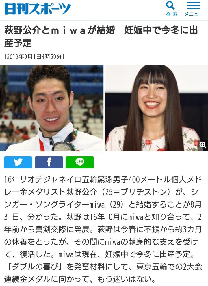 今秋結婚するmiwa (左)と萩野公介選手 (c)oricon news inc. 画像・写真 | miwa、競泳・萩野公介選手と今秋結婚へ miwaは妊娠 1枚目 | oricon news. 🌏 東京オリンピック2020 5月30日 10:30• 16年リオデジャネイロ五輪競泳男子400メートル個人メドレー金メダリストの萩野公介(25=ブリヂストン)と、シンガー・ソングライター、miwa(29)が今秋に結婚することが分かった。 萩野公介選手のmiwaさんとの結婚で180度激変した 競技生活が、絶不調の原因なのでしょうか。 リオオリンピック後、翌2017年世界選手権で200mと 400m個人メドレーでも完敗し、リオ五輪までは瀬戸大也 が萩野公介を. 2016年リオデジャネイロオリンピック400メートル個人メドレーの金メダリスト・萩野公介選手と今秋 結婚 、12月に出産予定であることを発表した女 優 でシンガーソングライターのmiwa。